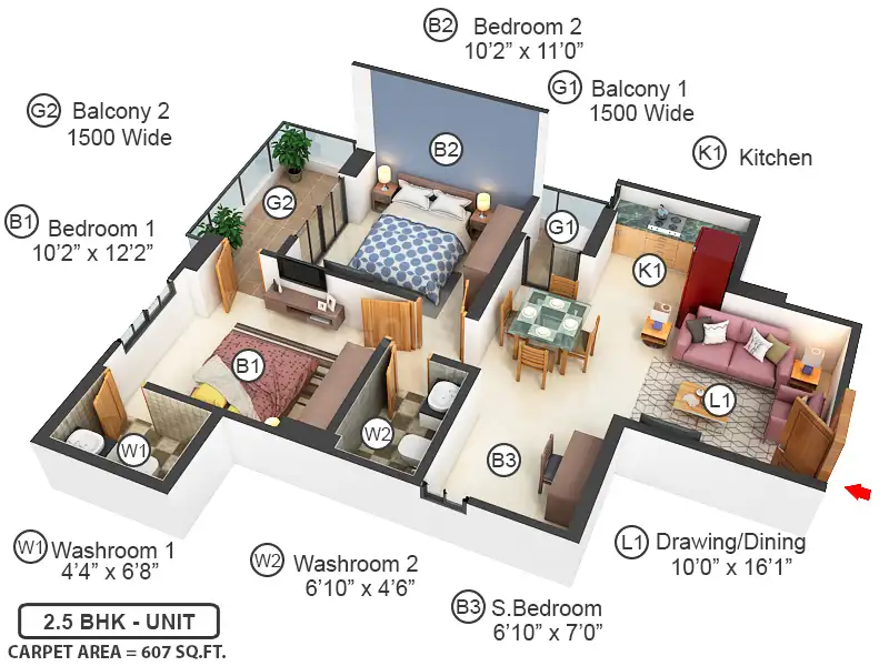 Size: Starts from (607-630 sq. ft. - 2.5BHK)
